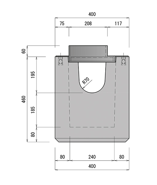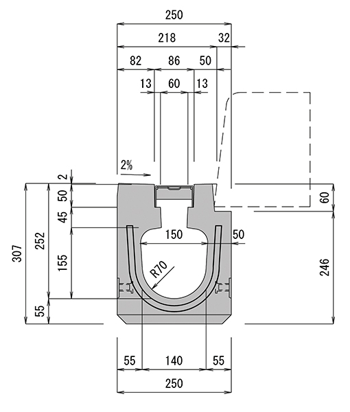 路面上の雨水を確実に排水できる連続開口の特徴を持つ商品で境界ブロックを側溝本体に直接布設出来る為、車道・歩道の幅員を最大限有効活用ができるタイプの商品です。