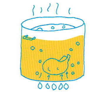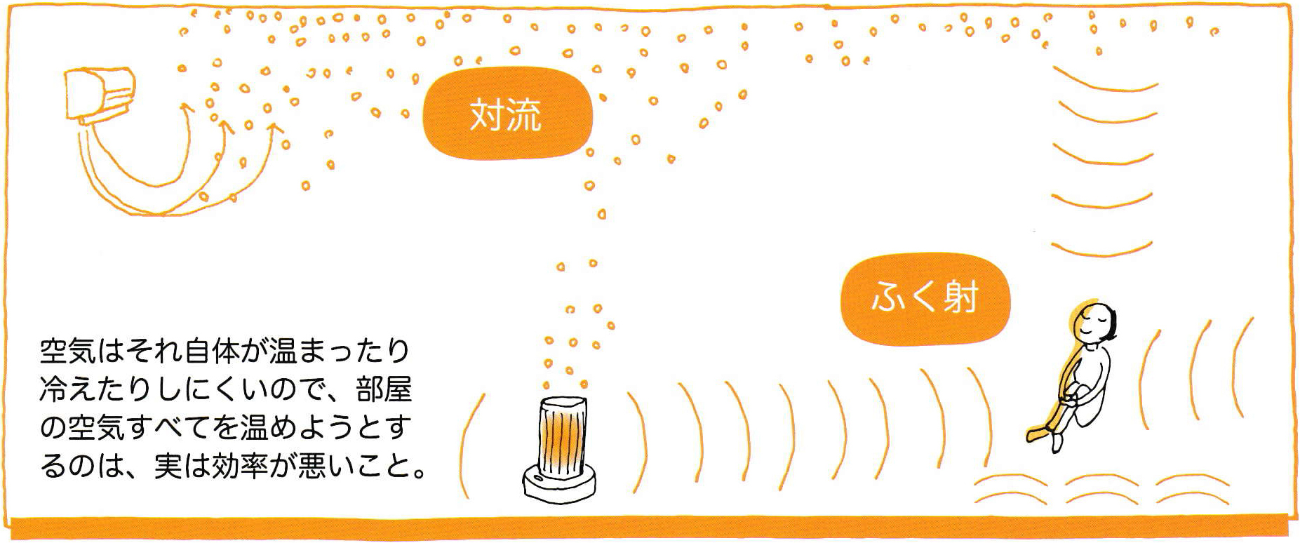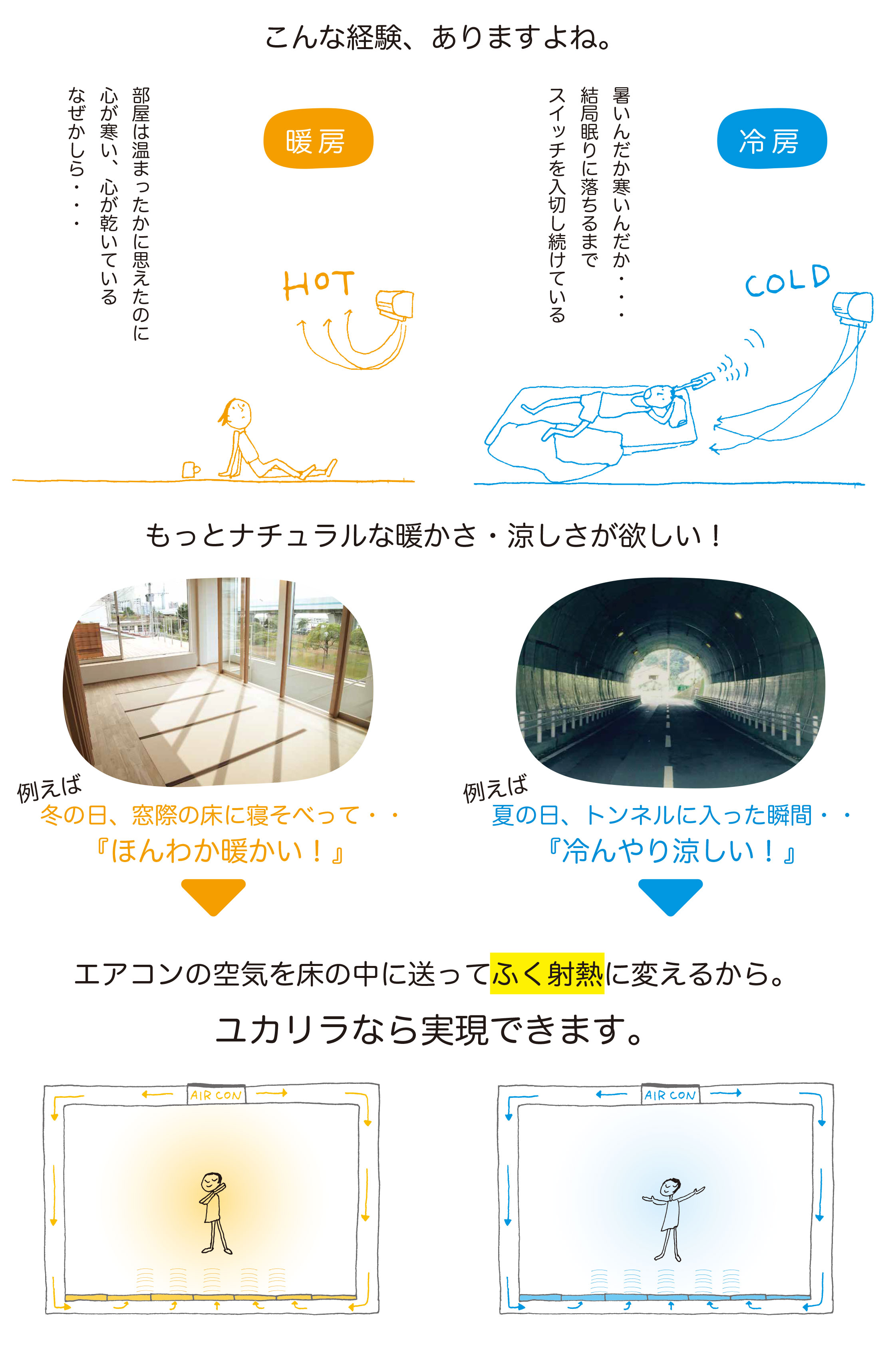 ふく射って? まず、『熱の伝わり方』は3種類 料理の仕方で見てみましょう。 1熱伝導 直接触れることで熱を伝えます。 2熱伝達(対流) 液体や気体を仲介して 熱を伝えます。 3熱放射(ふく射) 離れた場所にある物にエネルギーを飛ばして熱を伝えます。 ふく射熱の特徴は、離れた物に熱を伝えるということ。 ぽかぽかと暖かいひなたぼっこを想像してください。 太陽と地球の間には宇宙空間が広がっていますね。 そこは、空気がなくて、とても冷たい世界のはず。 なのになぜ太陽は宇宙空間を飛び越して、あなたを温めることができるのでしょうか? 実は、これがふく射熱のヒミツ。 太陽からは『遠赤外線』という形で熱が送られてきます。 この遠赤外線は間に空気があるか無いかに関係なく、遠く離れた温度差のある物に直接、熱を伝える事が出来るのです。 『対流』ではなく『ふく射』 ユカリラは日本の空調を大きく変えます。 一方、ふく射熱は部屋全体を均一に、自然に空調できるのです。
